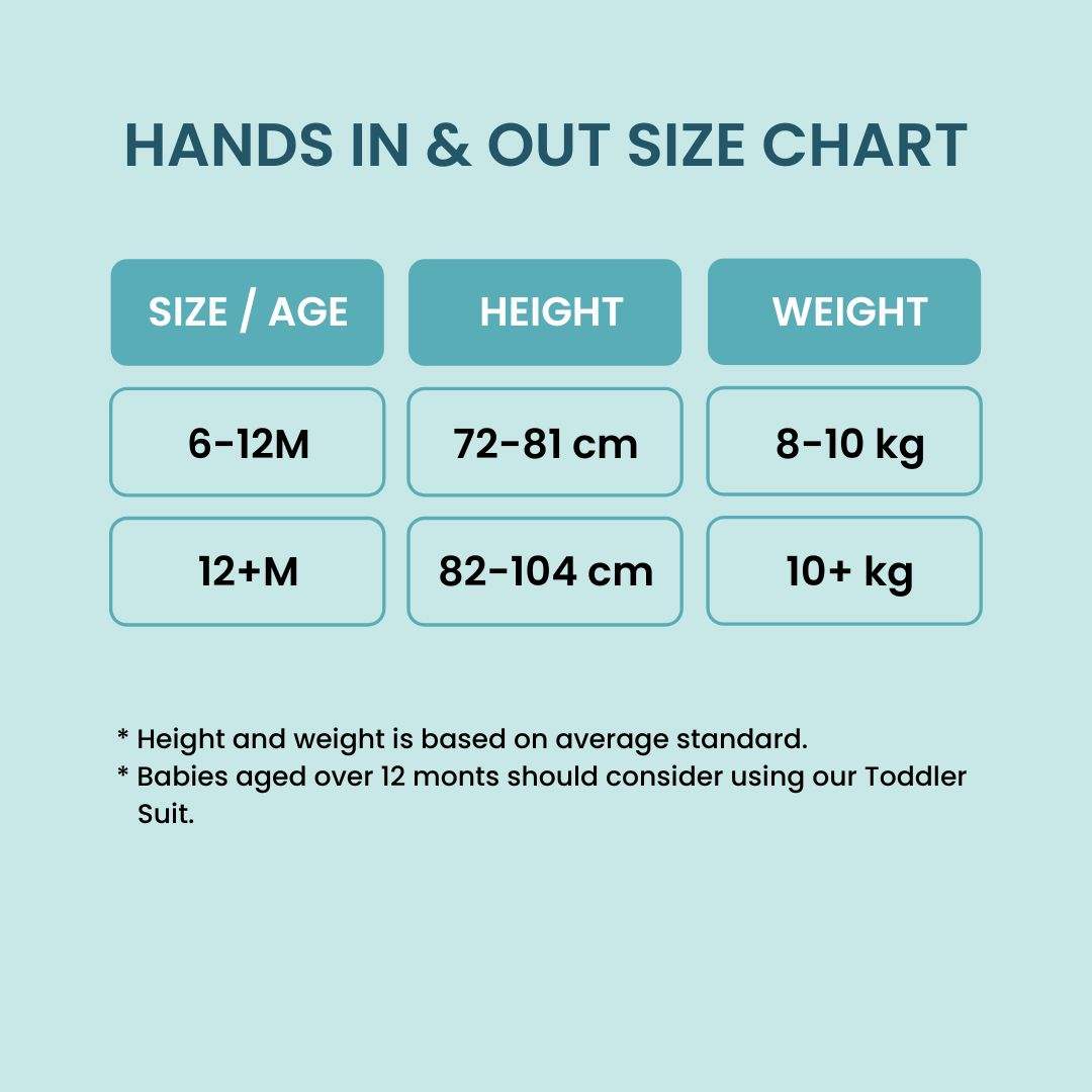 Designed to help your baby gently transition to free arms, the Sleepy Hugs sleep suit will be most effective if you choose the size that will give your baby a snug fit in the arms.