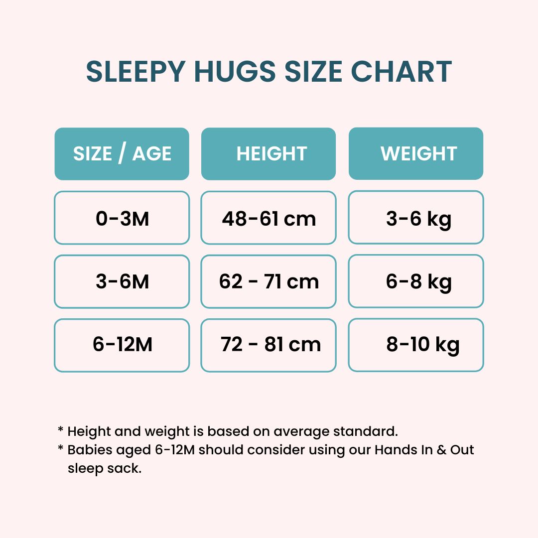 The Sleepy Hugs is all about the arm span - the key is to measure your baby's arm span to get the correct size. If too big, your baby will not get the security and snug fit that they still need in the arms. More importantly, if too big there could be excess fabric that could pose a safety risk.