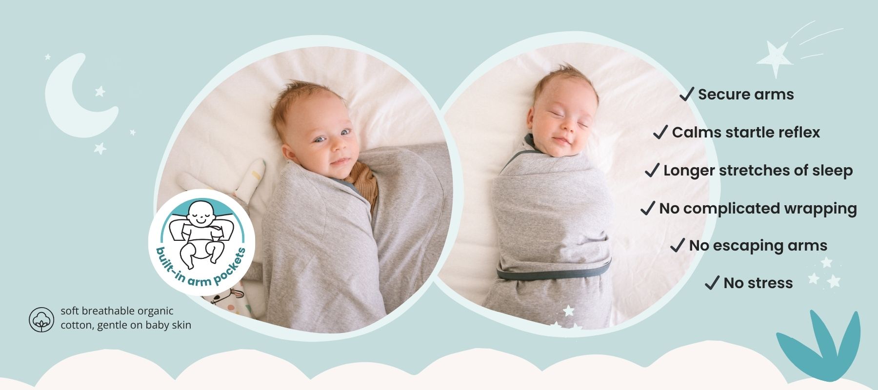 - Gently cocoons your baby’s arms to calm their startle reflex